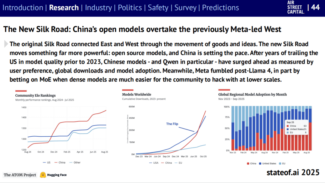图注:中国开源大模子(以 Qwen 为代表)正在机能、下载量取采费用上全面超越。标记着人类取AI关系的新阶段。AI 原生公司成为本钱市场新宠。国际AI管理机制正正在失效。
