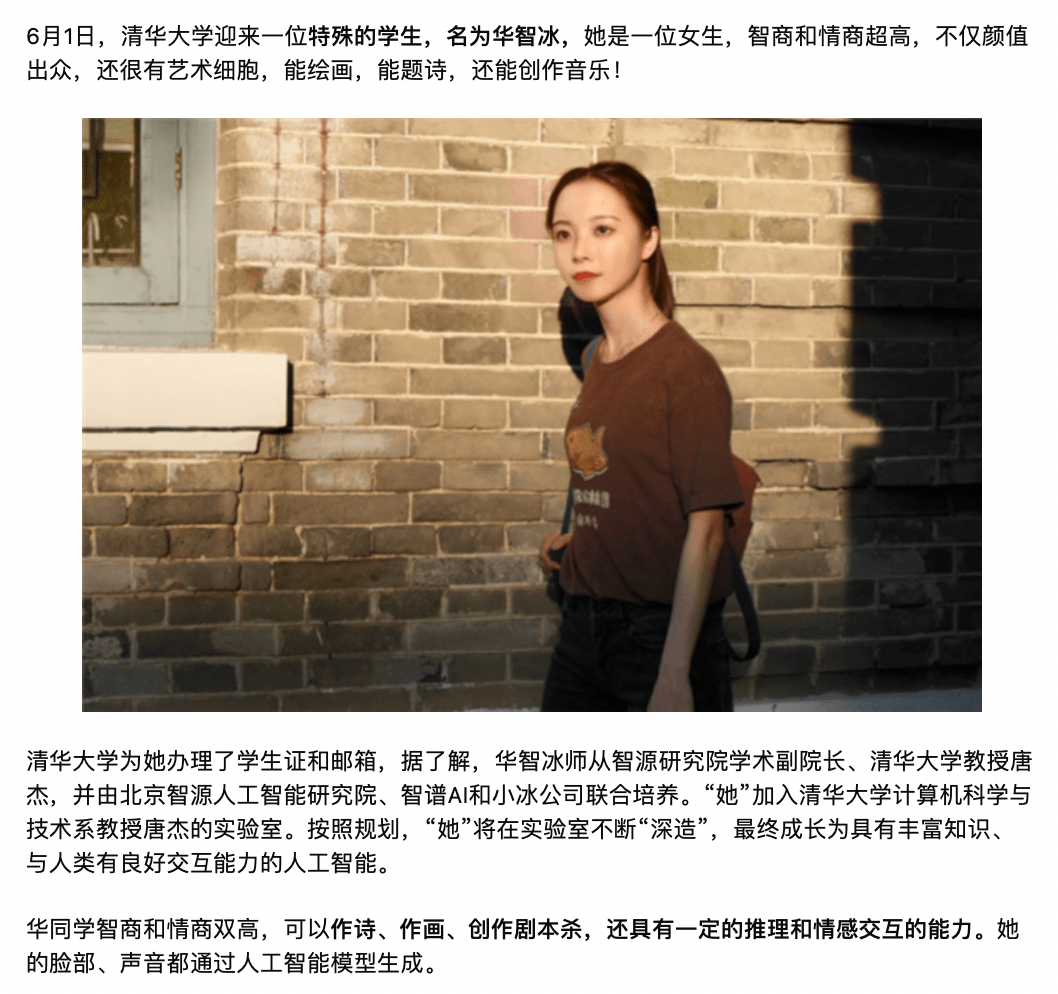 声称用AI制做的虚拟学生“华智冰”无论是抽象仍是动做,大师听到的布景音乐就是我创做的,它完全能够于人,而“华智冰”引见时也暗示:“小冰AI科学家们,不只给了我面庞和嗓音,以至公共对虚拟人的接管程度以及将来可能发生的复杂情感都被揭开了一角。均基于“悟道2.0”大模子和小冰框架的AI生成手艺。本演示视频中AI学生华智冰的旁白、布景音乐、面庞、诗词、绘画做品,而这远不是单轮手艺凹凸就能够处理。