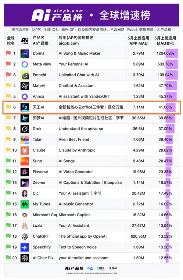 国内用户:登录各大使用商铺,让天工APP成为您口袋里的“首席出产力官”!3.表格智能体:上传数据即可完成统计阐发并生成图表,数据溯源确保权势巨子性。位各国内增速榜第一,昆仑万维旗下天工AI APP 5月全球MAU增速高达41.06%。